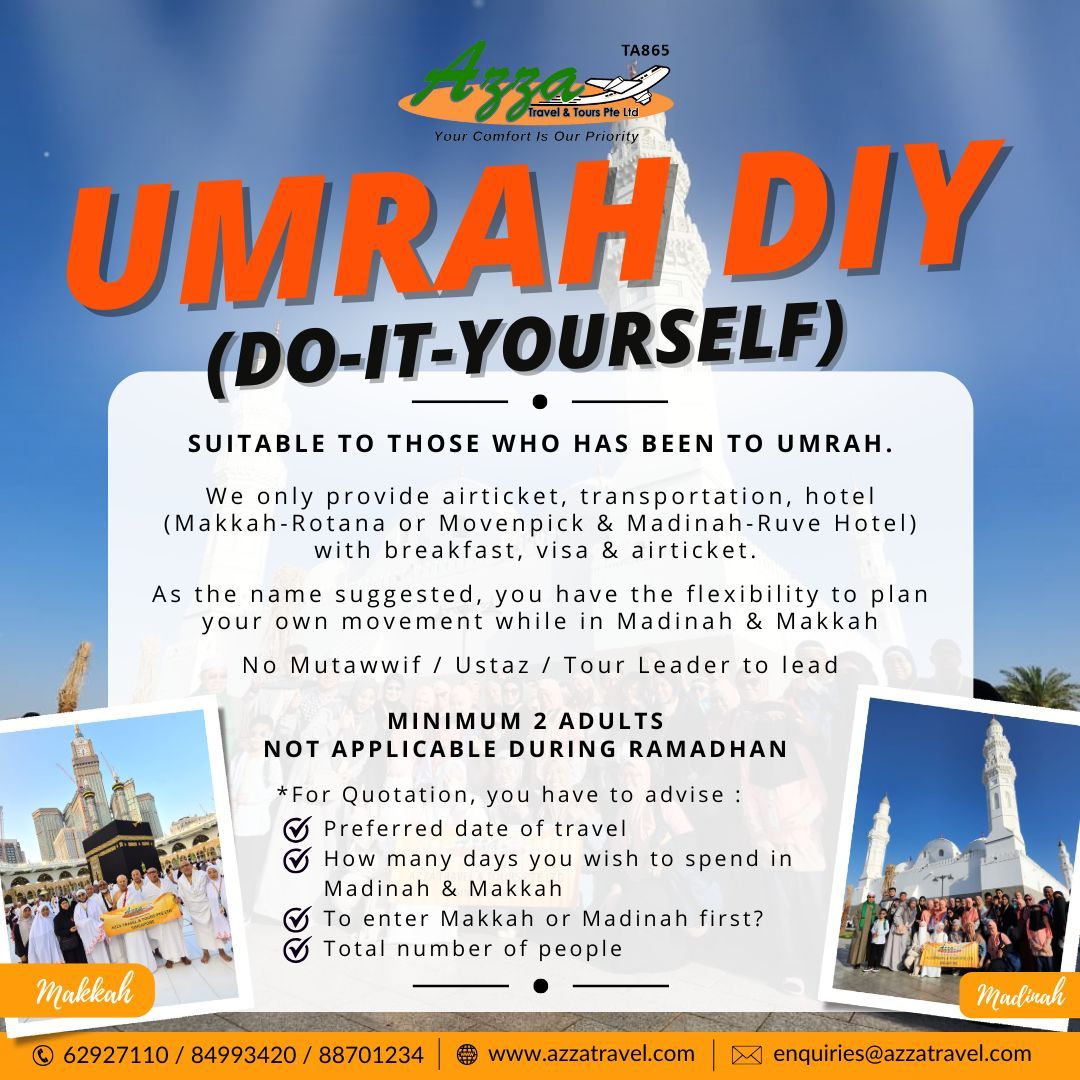 Umrah DIY is do-it-yourself. This is suitable to those who has performed Umrah before. As the name suggested, you have the flexibility to plan your own movement while in Madinah & Makkah.